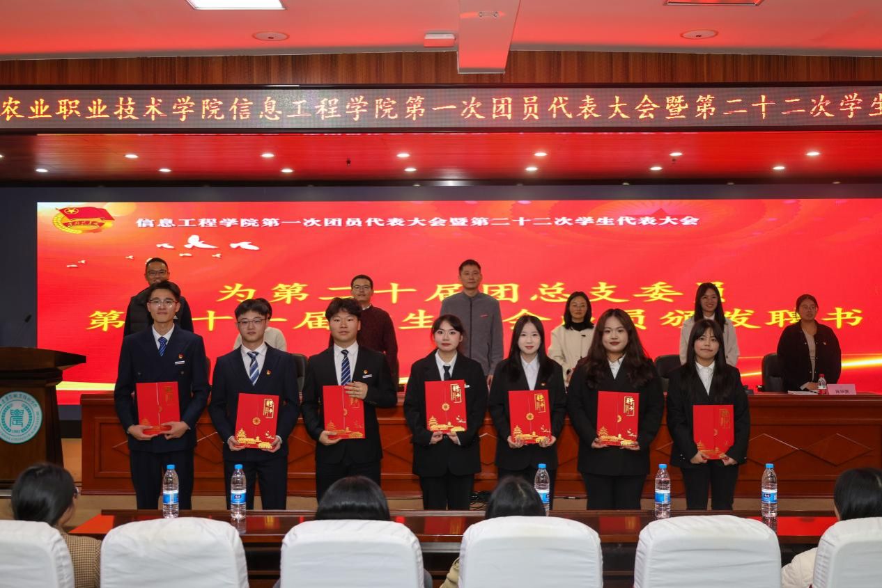 共青团信息工程学院第二十届总支委员代表林佳琪、信息工程学院第二十一届学生分会代表余斌在会议上作了工作报告,报告回顾和总结了我院团学组织与学生会开展的各项工作和取得的优异成绩,明确了下一阶段的工作目标和任务。最后,大会选举产生第一届团委委员和第二十二届学生分会主席团成员,并为上一届学生干部颁发了聘书。