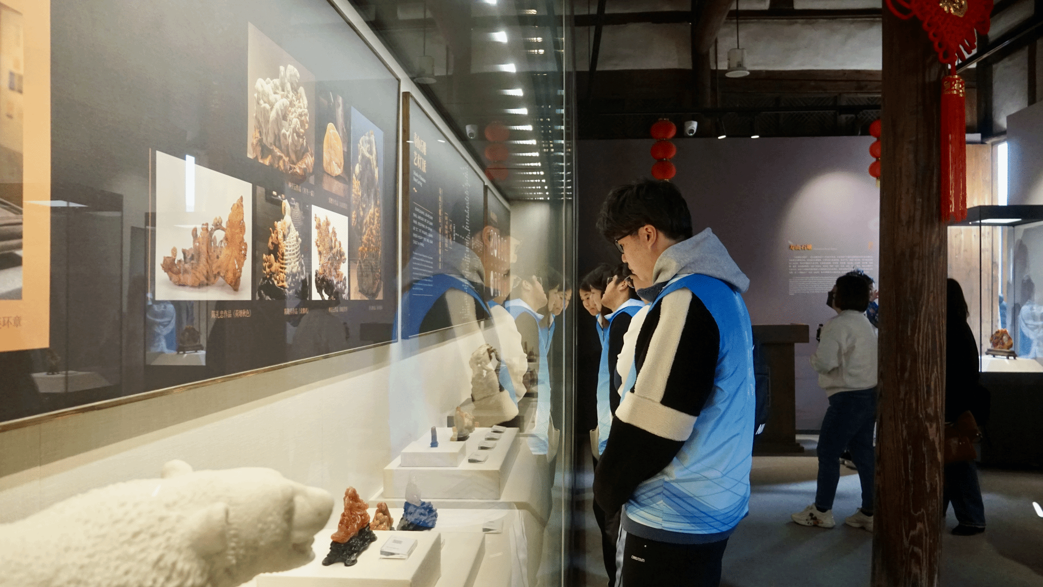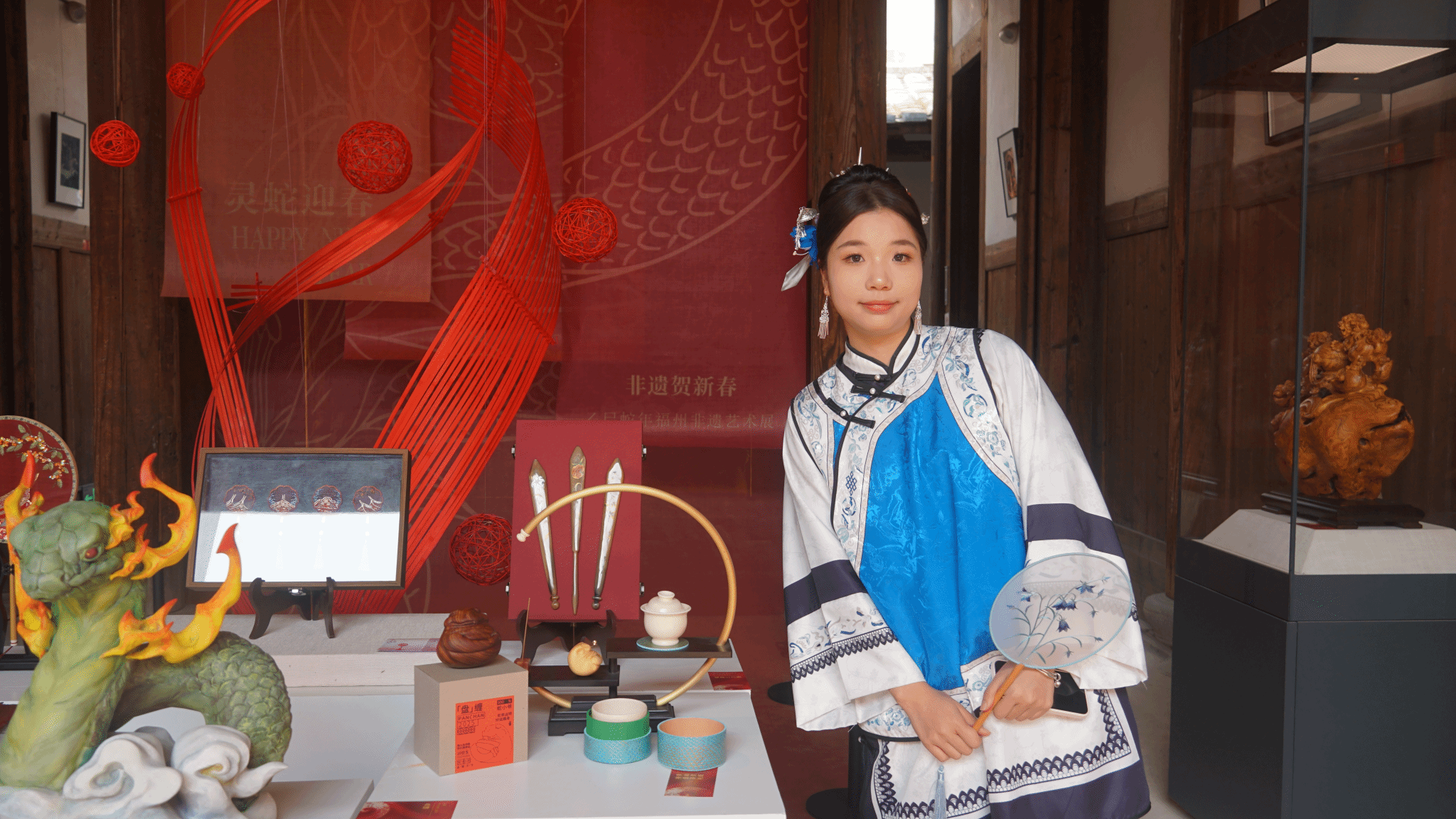 在福州非物质文化遗产展示馆,实践队成员们观赏了寿山石雕、脱胎漆器、福州评话、三条簪、福州传统风俗文化等多个展区,通过珍贵展品与生动图文的展示,更加了解了家乡非物质文化遗产的独特魅力。
