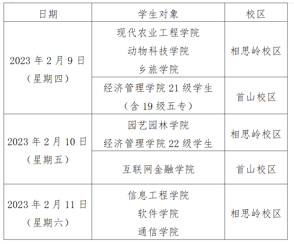 按照“错时错峰、分批分期”原则稳步推进2023年春季学期学生开学返校工作,所有学生无特殊原因不提前返校,不能按时返校的学生需向所在二级学院报备,并办理请假手续。2023屇毕业班学生暂不返校,学生根据各二级学院原岗位实习安排计划参加顶岗实习。