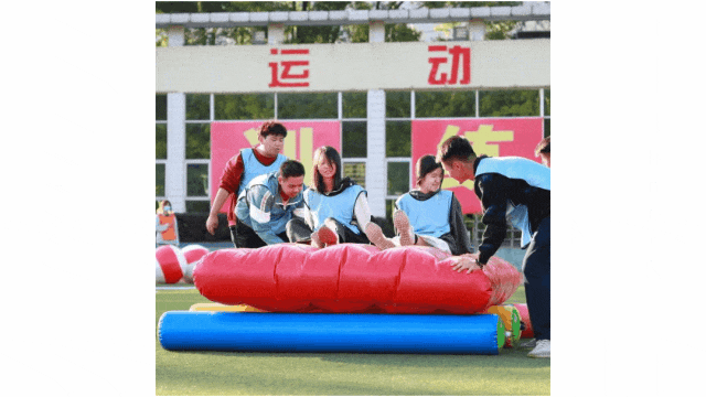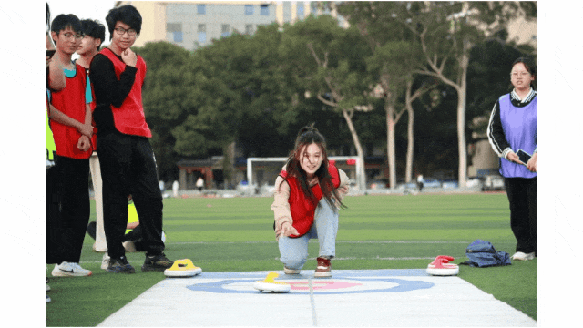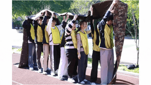 活动分为团队组建、展示、挑战、总结等环节。在素质挑战环节中,设置了“履带战车”“众心捧月”“鼓动人心”“俄罗斯方块”“与时俱进”“旱地冰壶”“与子同袍”“保驾护航”“极限飞盘”等10个游戏。各项游戏需要团队高度的协作能力和配合能力,极大地考验学生的毅力和耐力,大大提升了学生的团队意识和合作精神,强化了学生集体效能感,增强了团队的凝聚力和向心力。