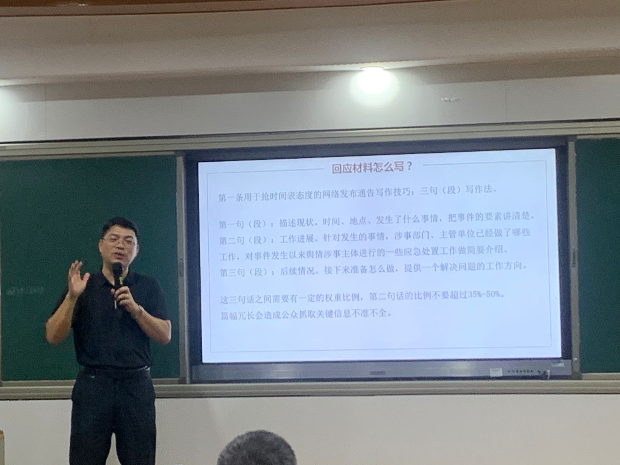 8月17日下午,学院在首山校区会议室举办网评员工作暨舆情处置培训会,学院领导、宣传部全体人员、两校维稳应急专班成员及学院一二级网评员参加了培训。培训会由学院宣传部部长詹其仙主持,福建千亿信息公司总经理方敏强为受训人员做舆情工作专题讲座。