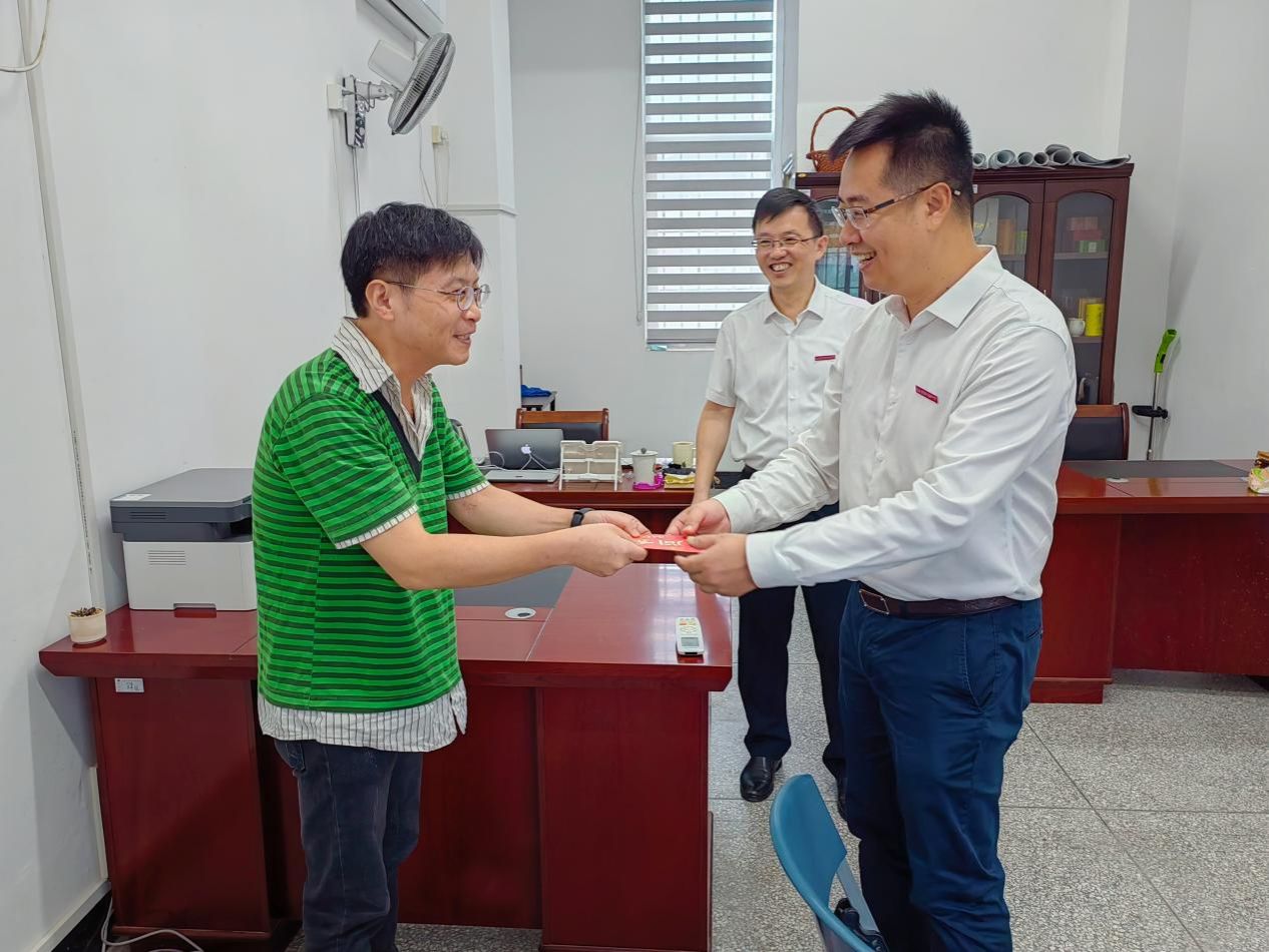 一声问候情意浓,一句祝福暖师心。在第39个教师节到来之际,为弘扬尊师重教的优良传统,9月8日上午,学院党委书记杨振坦、院长何东进带队深入二级单位开展教师节走访慰问活动,向辛勤耕耘在教育教学一线、为学校教育事业发展作出积极贡献的广大教职员工致以崇高敬意和诚挚问候。学院纪委书记陈坛春、组织部部长(工会常务副主席)、人事处处长等陪同参加。