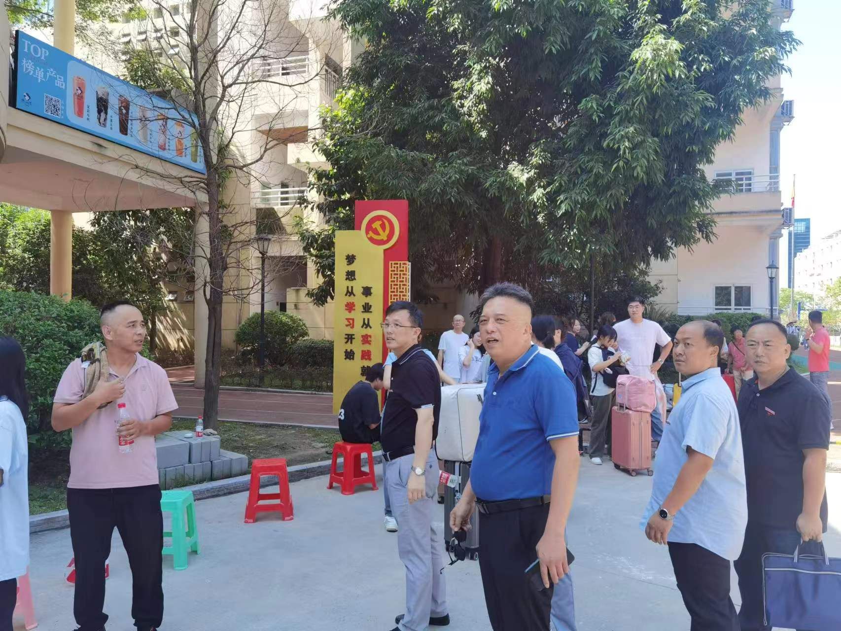 杨振坦书记(右二)、何东进校长(左二)、王振亮副书记(左一)与新生家长交谈