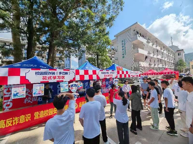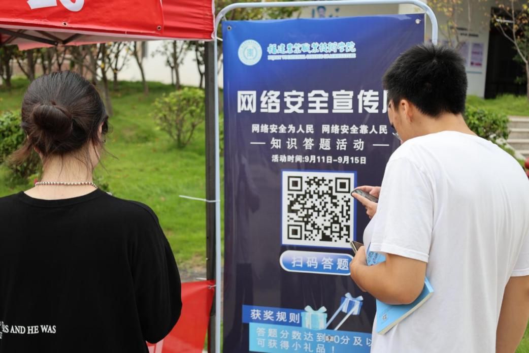 在学生宿舍11号楼前设置的国家网络安全宣传周活动点,由开元(中国)安全保卫处、现代教育数字中心的老师,以及福清网安大队的警官,向过路学生发放宣传手册,并邀请学生扫码答题,以此开展网络安全知识宣传,普及国家网络安全法律法规,热情讲解常见电信网络诈骗手法和新型AI诈骗手法,提供个人信息保护建议,提高学生反诈骗识别能力和防范能力。