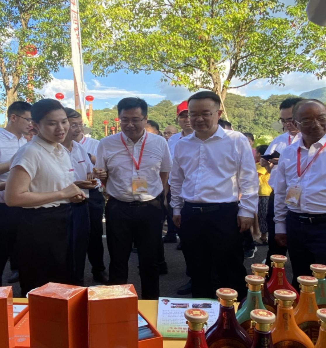 王金福副省长(右二)、谢华安院士(右一)参观福农黄曲酒系列展品