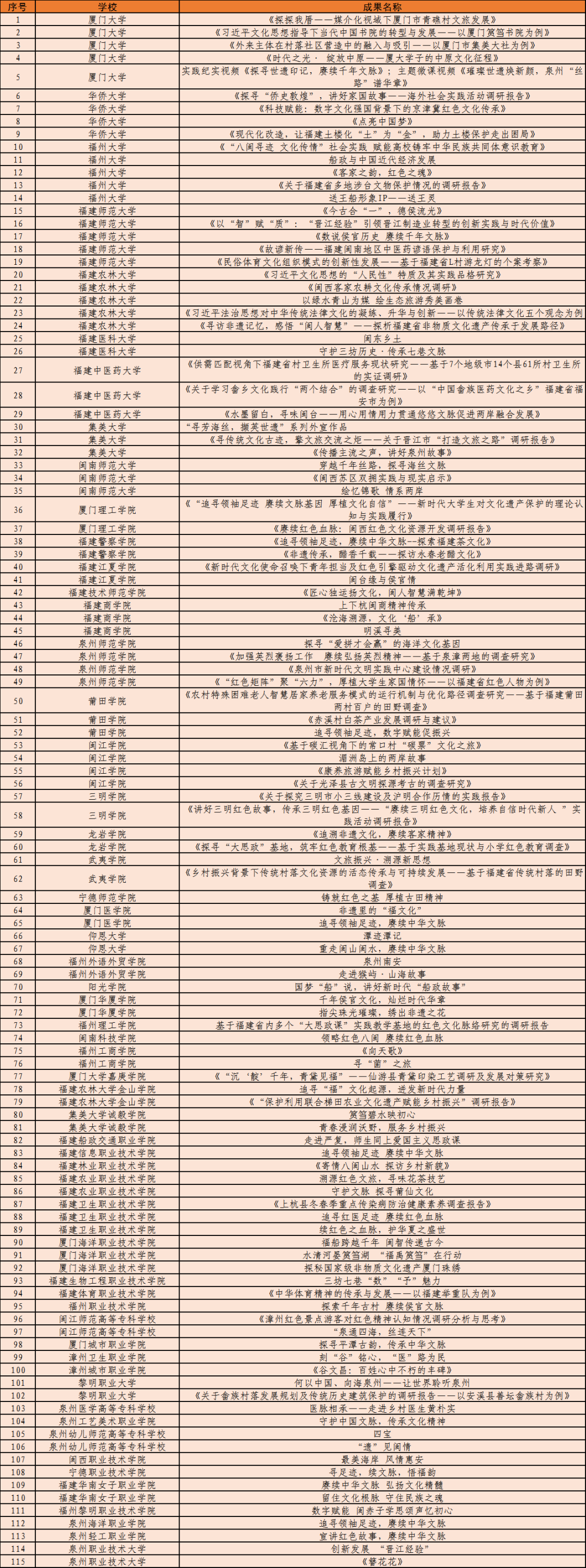日前,中共福建省委教育工委印发《关于公布“追寻领袖足迹 赓续中华文脉”2023—2024学年全省大学生寒假主题社会实践活动评选结果的通知》,经高校推荐、专家评审、网上公示等环节,评选出优秀组织奖20个、优秀实践团队70个、优秀实践个人115名、优秀实践成果115项。