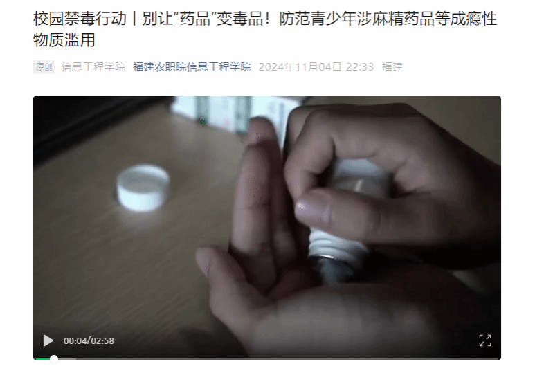 学院充分发挥新媒体宣传阵地作用,创新和丰富内容形式,通过多元化的宣传模式拉近与学生的距离,扩大宣传覆盖面、提升传播效果,紧随新闻和网络热点,拍摄了《别让“药品”变毒品!防范青少年涉麻精药品等成瘾性物质滥用》系列视频,通过定制视频主题及Led宣传屏,用身边的小故事反映毒品危害的大主题,让学生通过最直观易懂的方式了解禁毒知识,取得了良好的效果。
