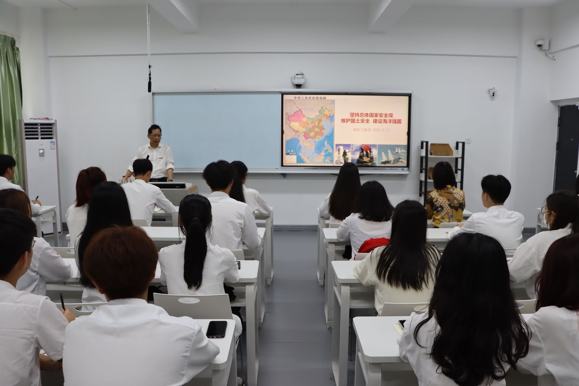 5月17日下午,学院党委副书记王振亮在教学综合楼为团委党支部全体党员、二级学院团总支书记及团学骨干讲授“坚持总体国家安全观”主题教育专题党课。 王振亮副书记上专题党课王副书记首先从历史方位、思想继承和国际经验等方面阐述了总体国家安全观的背景、意义和主要内容;聚焦实际案例及国内外形势,生动揭示了总体国家安全观的核心要义,并通过丰富的图文史料,从国家层面和公民层面介绍了维护国家安全的主要任务。 师生代表认真听课“...